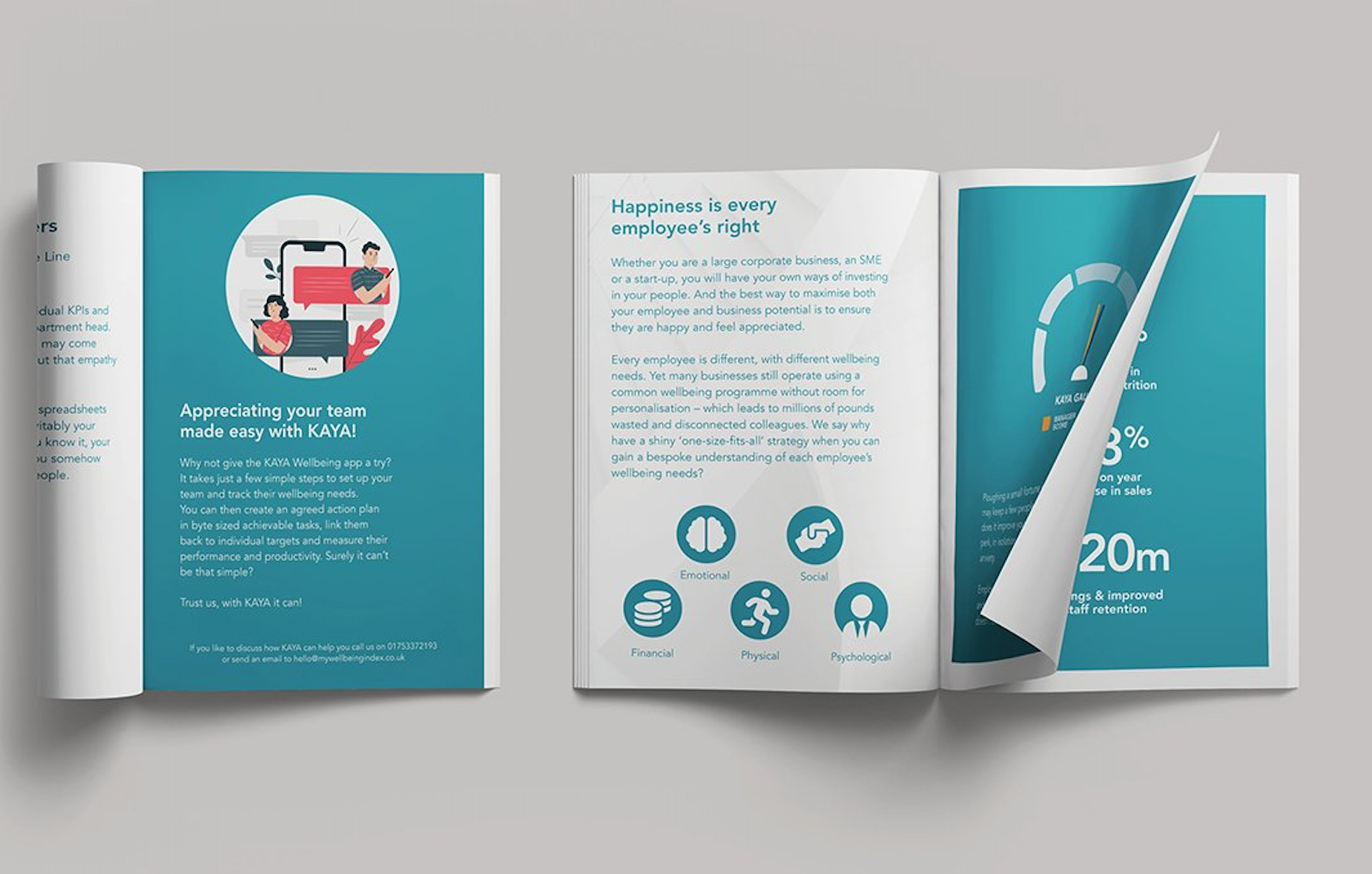 Content creation for a brochure promoting KAYA Wellbeing, an app developed to encourage happiness and positivity in the workplace.